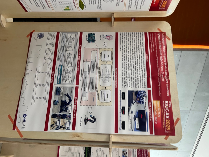 참관내용 | 이번 IEEE BioCAS 2025 학회는 바이오신호 처리, 초저전력 회로 설계, 신경형(Neuromorphic) 시스템, 인공지능 기반 생체신호 분석 등 다양한 융합 주제를 다루며, 시스템반도체의 관점에서 의미 있는 기술적 통찰을 얻을 수 있었다. 특히 Biomedical IC 및 AI Hardware Accelerator 관련 세션에서는 최근의 연구 경향이 기존의 단순 신호처리 중심 회로 설계에서 벗어나, AI 모델과의 하드웨어 통합 및 적응형(Adaptive) 회로 설계 기법으로 확장되고 있음을 확인할 수 있었다. 저전력 생체신호 측정 회로, SoC(System-on-Chip) 통합 기술, 및 AI 가속기의 효율적 연산 구조 등은 향후 시스템반도체 연구에서 중요한 역할을 할 것으로 보인다. 이번 학회에는 대형 반도체 기업의 공식 부스나 기업 연구진의 발표는 많지 않았으나, **데모 세션(Demonstration Session)**을 통해 다양한 응용 기술을 직접 확인할 수 있었다. EEG(뇌파) 및 EOG(안구운동) 신호를 이용한 바이오메디컬 신호처리 및 AI 분석 응용 시스템의 실시간 동작 시연이 인상적이었다. 이러한 시스템은 회로 수준에서 신호를 정제하고, AI 모델을 이용해 사용자의 생리 상태를 추정하는 구조로 구현되어 있었다. AI 가속기(Accelerator) 데모에서는 소형화된 프로세서 기반의 신경망 연산 가속 기술이 소개되었으며, 연산 효율 향상과 전력 절감을 동시에 달성하는 다양한 구조적 접근 방식을 관찰할 수 있었다. 또한 단백질 농도 측정용 CMOS IC, 바이오센서 신호 변환 회로, mixed-signal 기반 생체신호 측정 칩 등의 회로 기술이 시연되어, 실제 하드웨어 설계와 응용 간의 연계성을 직접 체감할 수 있었다. 이러한 경험을 통해 회로 설계 단계에서의 기술적 선택이 바이오응용 시스템 전체의 성능에 미치는 영향을 구체적으로 이해할 수 있었으며, 향후 연구에서 AI 기반 신호처리와 회로 설계의 공동 최적화(co-design) 접근을 적용할 수 있는 가능성을 확인하였다. | |||||