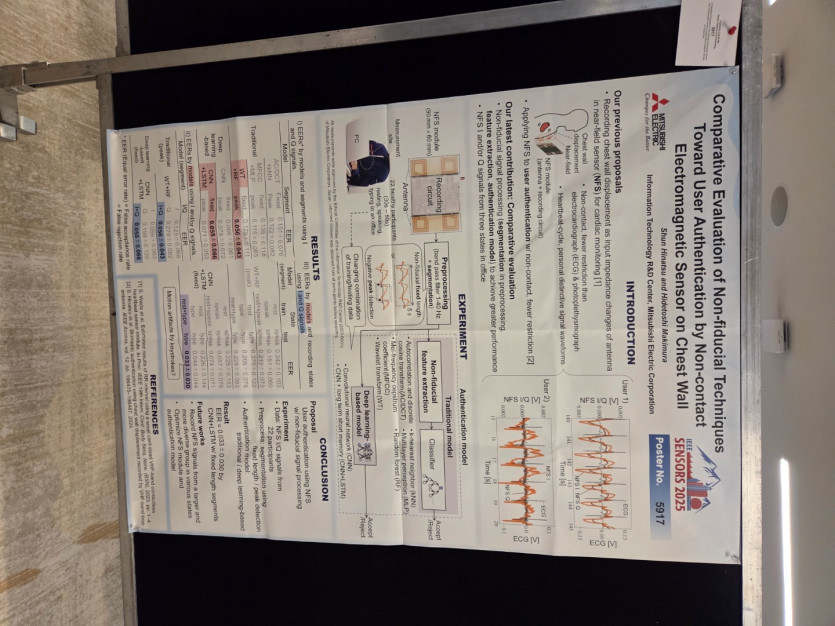 Chest wall 변위를 근접장 안테나의 I/Q 신호로 비접촉 측정한 뒤, 기준점 없이(non-fiducial) 사용자 인증을 수행하는 프레임워크를 비교 평가한 연구 결과이다. 전처리 후 전통적 특성(MFCC/WT/AC-DCT 등) 및 kNN/MLP/RF와, 딥러닝(CNN, CNN+LSTM)을 비교한 결과, 고정 길이 세그먼트 기반 CNN+LSTM이 EER = 0.033 ± 0.030로 최저 오차를 달성했다(피로/자세/발화 등 사무실 환경 유사 상태 데이터). 비접촉·저제약 환경에서 ECG/PPG 대비 프라이버시/편의성 이점이 크며, 모듈·모델 최적화 및 피험자/상태 확장에 따라 상용 인증으로의 확장 가능성을 제시했다. 생체신호 기반 엣지 인증의 실무적 지표(EER)로 성능을 제시한 점이 유익했다. IEEE SENSORS 2025 학회에 참석하여 웨어러블 디바이스 연구에 대한 최신 동향과 기술을 심도 있게 파악할 수 있었다. 본 학회를 통해 웨어러블 기기, 특히 neck microphone의 잠재력과 이를 활용한 데이터 수집 및 분석 기술에 대한 통찰을 얻었으며, 이는 향후 건강 상태 모니터링과 관련된 연구에 유용하게 활용될 것으로 기대된다. 또한, 실무자들과의 교류를 통해 데이터의 수집 및 분석 방법론을 공유하고 웨어러블 비아리스 개발에 필요한 기초를 마련할 수 있는 기회였다. 나아가 인공지능과 기계학습 기술을 활용하여 실시간 구동 인공지능 모델을 개발하는 연구에 응용할 수 있는 다양한 아이디어를 얻는 성과를 이룰 수 있었다. | |||||