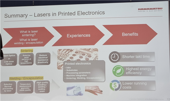먼저 printed electronics란 도체, 부도체, 반도체를 printing 하는 방식으로 회로를 구성시키는 기술의 결과물들을 통칭하는 단어입니다. 해당 세미나에서는 특히 laser sintering을 이용한 방법으로 만든 printed electronics에 집중되어 있었습니다. Laser sintering이란 화합물, 가열 등의 화학적 방법론을 이용하지 않고 고에너지의 laser를 이용해서 nano 단위의 pattern을 그리는 방식입니다. 기판에 support 등의 추가적 구조가 강제되지 않으며, 비교적 저온 및 저에너지에서, 보다 다양한 소재의 기판에 사용할 수 있다는 장점이 있습니다. 해당 기술을 이용하면 flexible한 소재의 회로를 만들 수 있다는 가장 큰 특징이 있어, 여러 분야에 적용을 하는 중이라고 합니다.