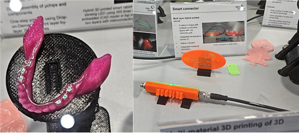 Free-form 3D printing of 3D electronics는 전자회로를 3차원으로 인쇄하는 새로운 기술입니다. 이 기술을 통해 전통적인 2차원 회로 설계의 제약을 극복하고, 더욱 복잡하고 고성능의 전자기기를 제작할 수 있습니다. 실제로 전시회에서는 사람의 이빨 모양과 일치하게 전자기기를 제작한 것을 확인 하였습니다.